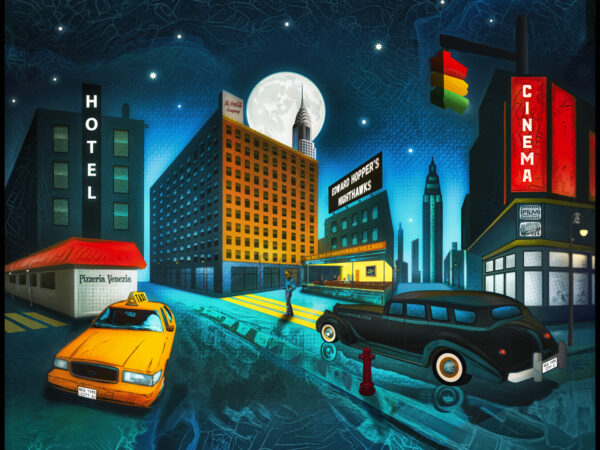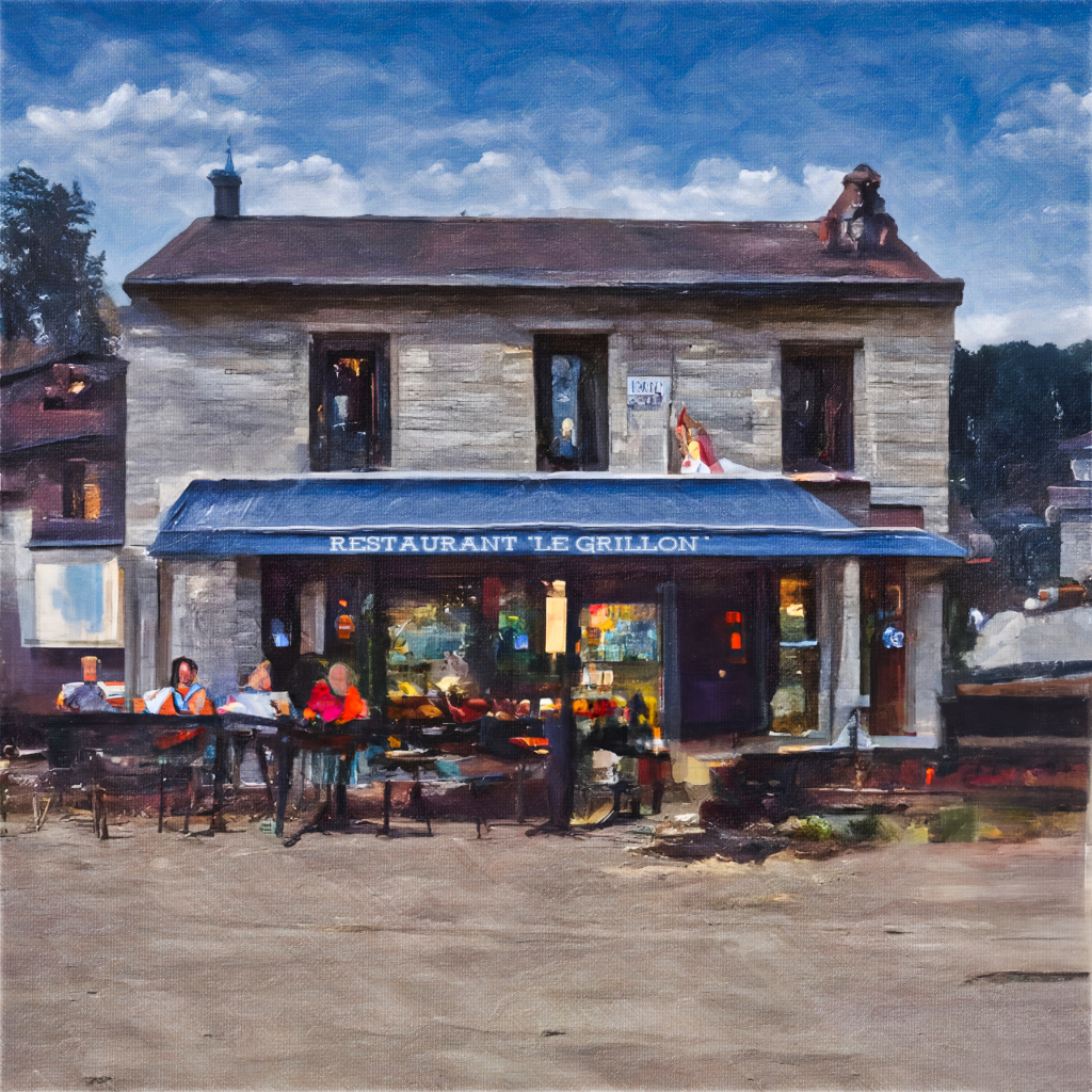Peinture numérique dans le style de l’époque de la fin du 19ème siècle, représentant le restaurant « Le Grillon » à Saint-Pierre-des Corps en Touraine.